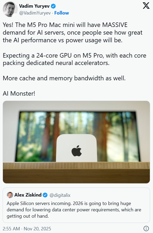 2025年第三季度,今天就多点等候,多台M5 Pro款Mac mini构成的系统,同比增加12.1%;而且按照专业爆料人士透露?